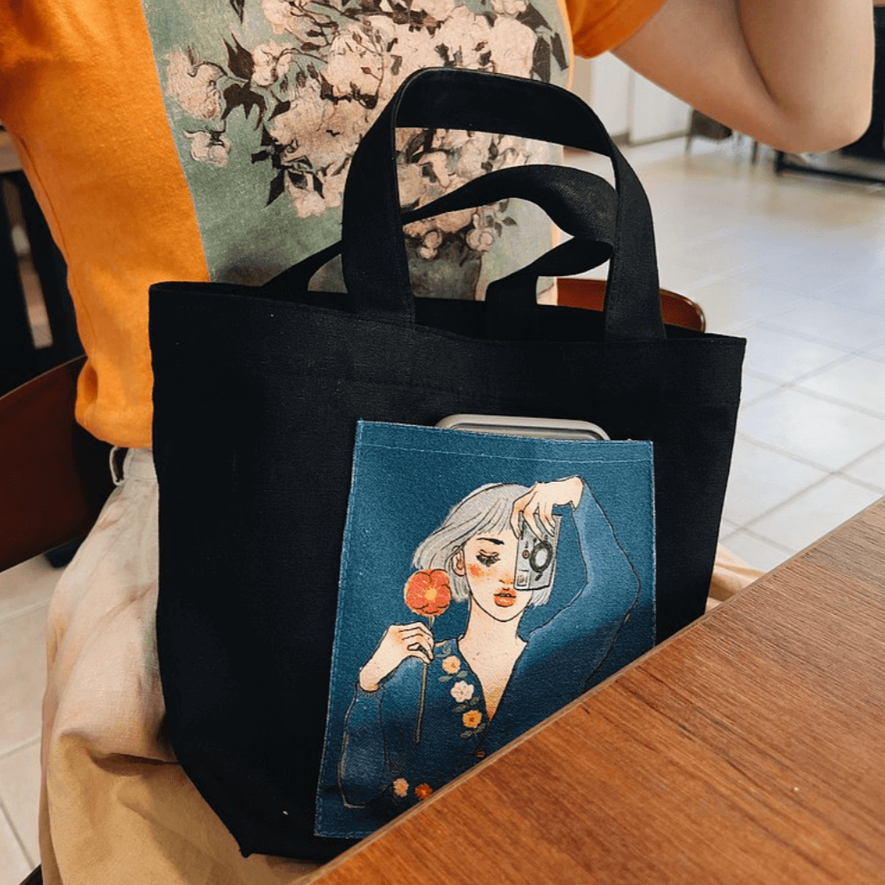 Beautiful canvas bag in calm deep blue colour, printed with lovely illustration of La Dolce Vita and rich details. We believe that you will bath in happiness when using this canvas bag, whether as your lunch bag or the ideal storage (large storage space!) for organising your notebooks, favourite stationery or any other items you wish to bring along with you. It has a front pocket at the front where you could store your small accessories and cellphone.