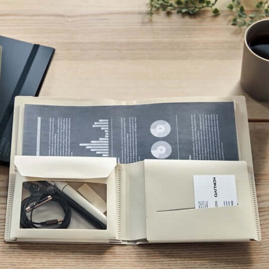 A slit designed to accommodate documents ranging from business cards to A6 size adds to the file's adaptability.