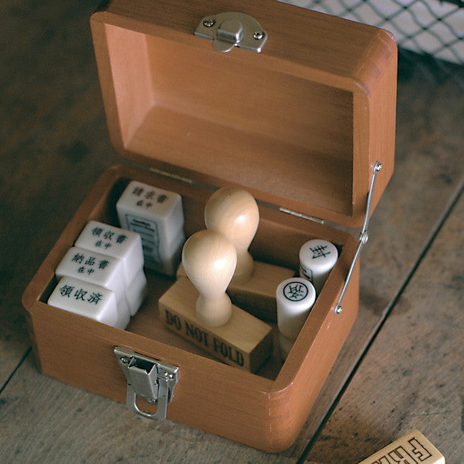 A beautifully crafted miniature wooden toolbox, perfect for organising your rubber stamp collection, washi tapes, and various art supplies. This exquisitely designed toolbox features intricate details, including decorative hinges, a metal handle on the top, and a storage compartment in the lid.