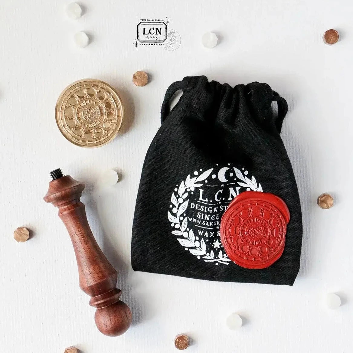 This wax seal set comes in a simple yet beautiful drawstring pouch, with the perspective pattern of the wax seal on the pouch, and a pack of wax seal beads.